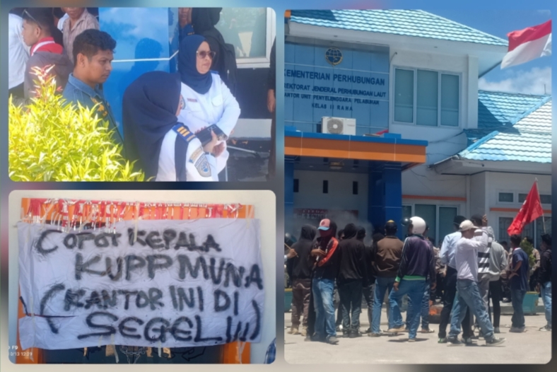 Muna, Sultramedia – Sejumlah massa aksi yang tergabung dalam Gerakan Masyarakat Muna Raya Bersatu (GMMRB) bersama Gerakan Mahasiswa Nasional Indonesia (GMNI) melakukan pengusiran paksa terhadap pegawai Kantor Unit Penyelenggara Pelabuhan (UPP) Kelas II Raha, saat menggelar unjuk rasa, Senin (13/10/2025).